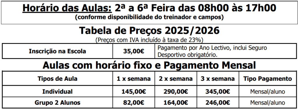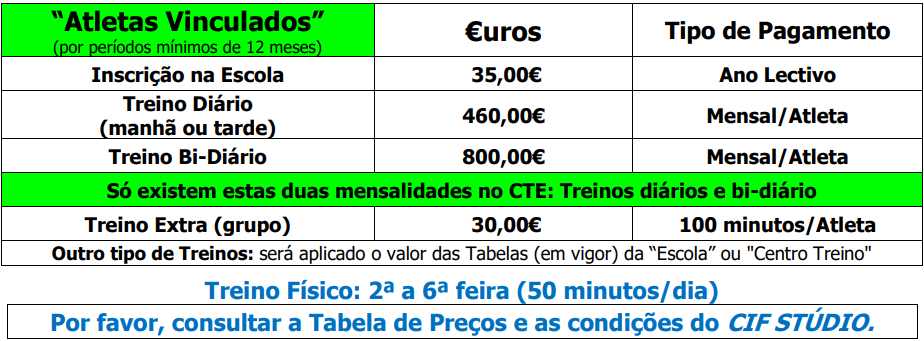 Secretaria da Escola de Ténis do CIF/MP Ténis Horário: 2ª a 6ª Feira: 10h00 às 12h30 e 15h00 às 19h00 / Sábado: 10h00 às 13h00 Telf.: 21 301 9149 | escola.tenis.cif@gmail.com | www.mptenis.pt | Instagram É obrigatório todos os alunos serem sócios do CIF. Informações na portaria ou no site do Clube. |